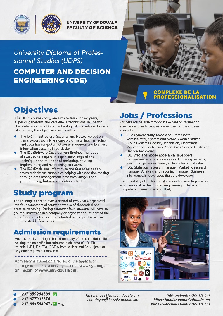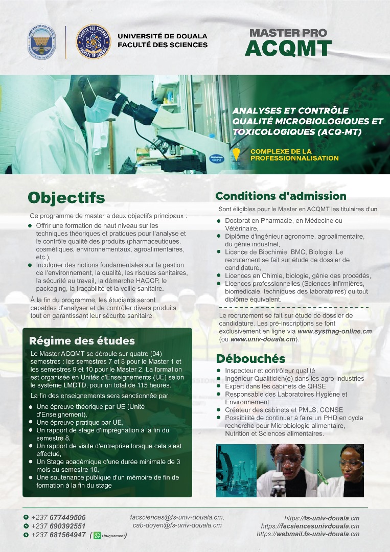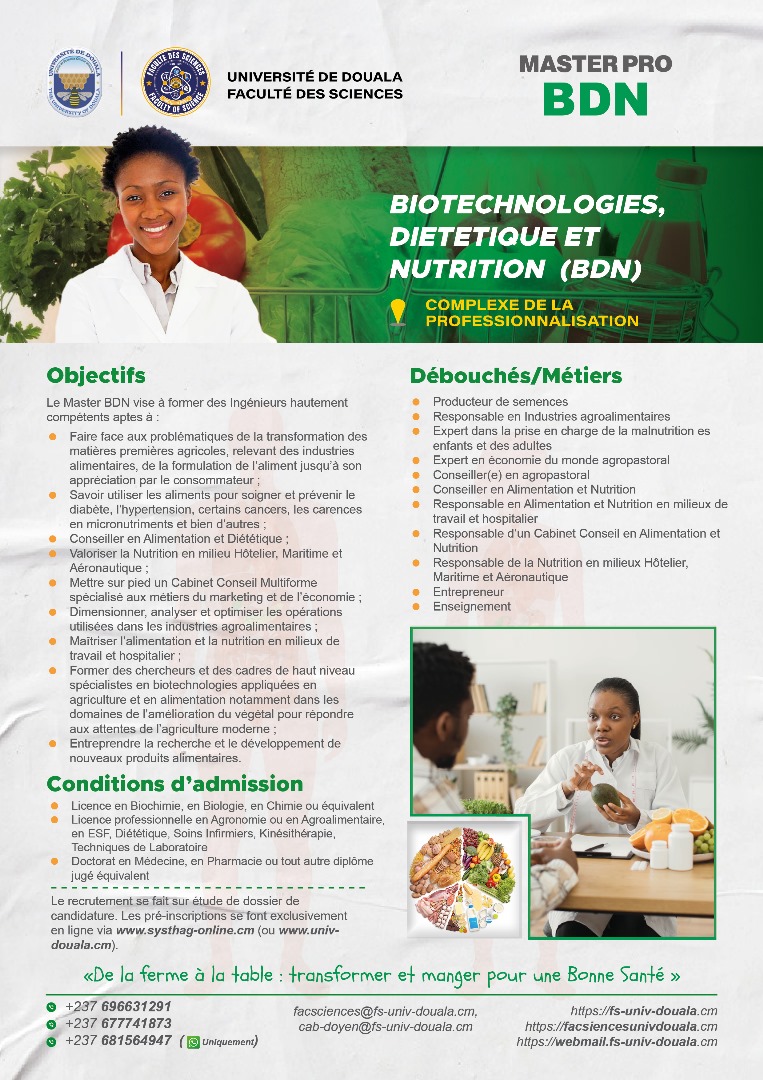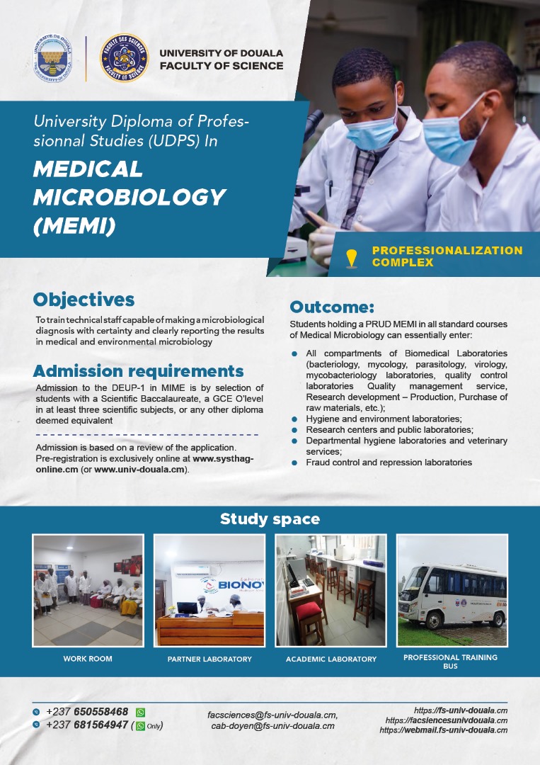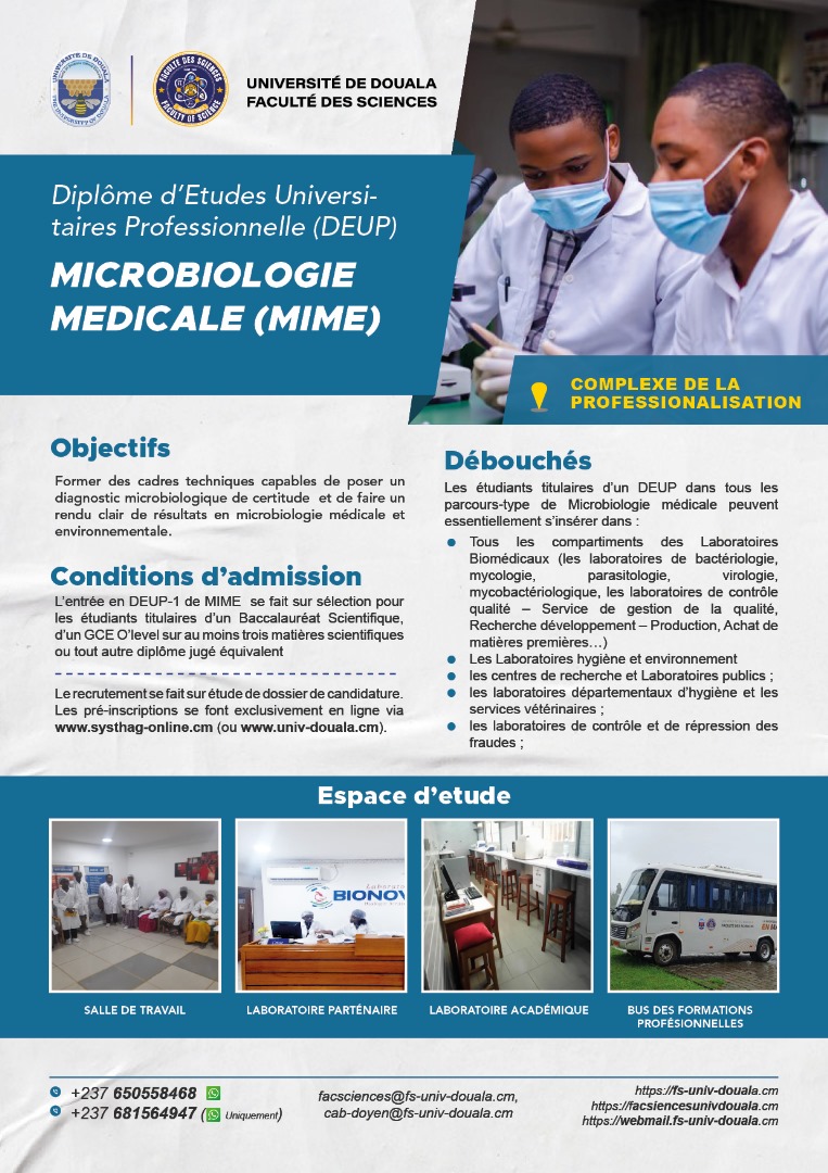 La faculté des sciences de l'Université de Douala, vous offre, en dehors de ses filières en formation initiale, les filières professionnelles ci-dessous.