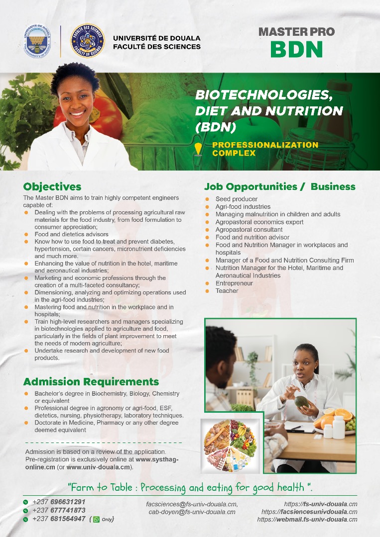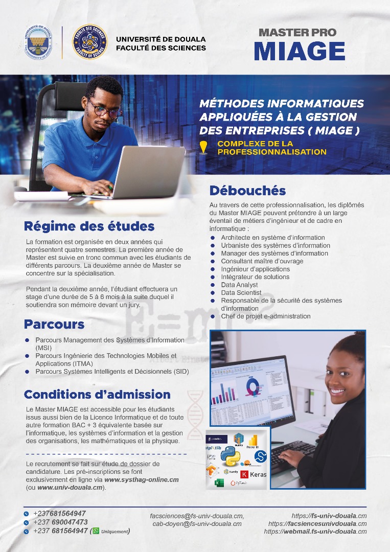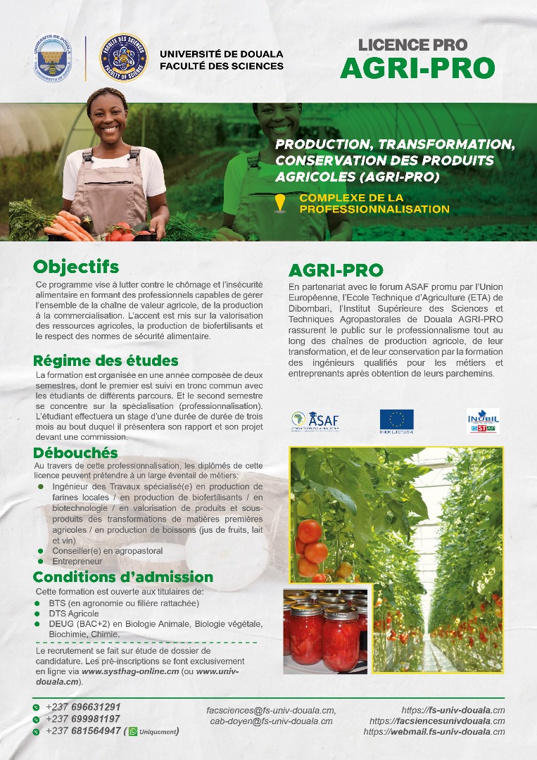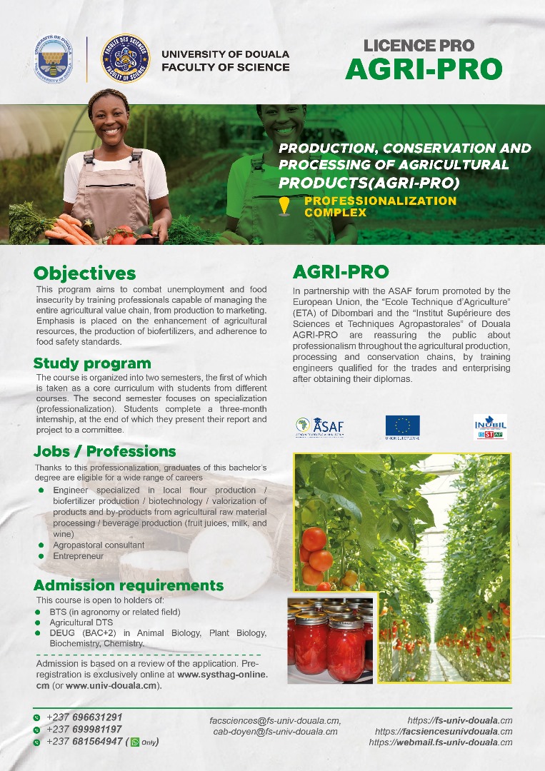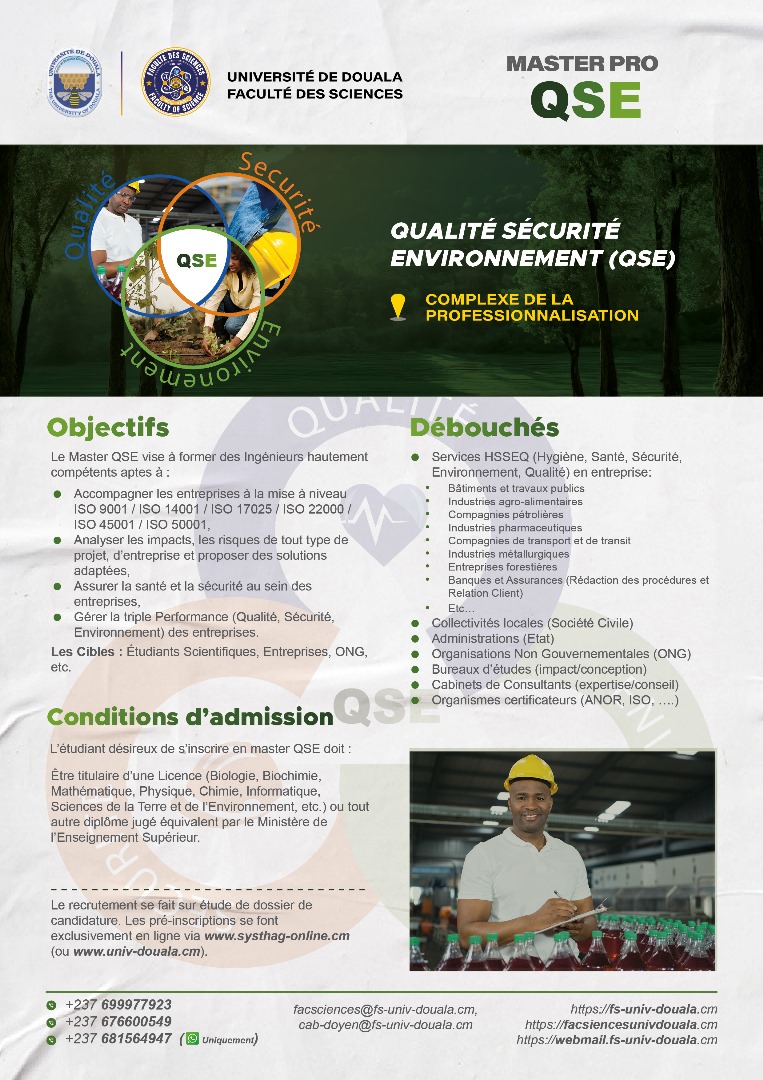 La faculté des sciences de l'Université de Douala, vous offre, en dehors de ses filières en formation initiale, les filières professionnelles ci-dessous.